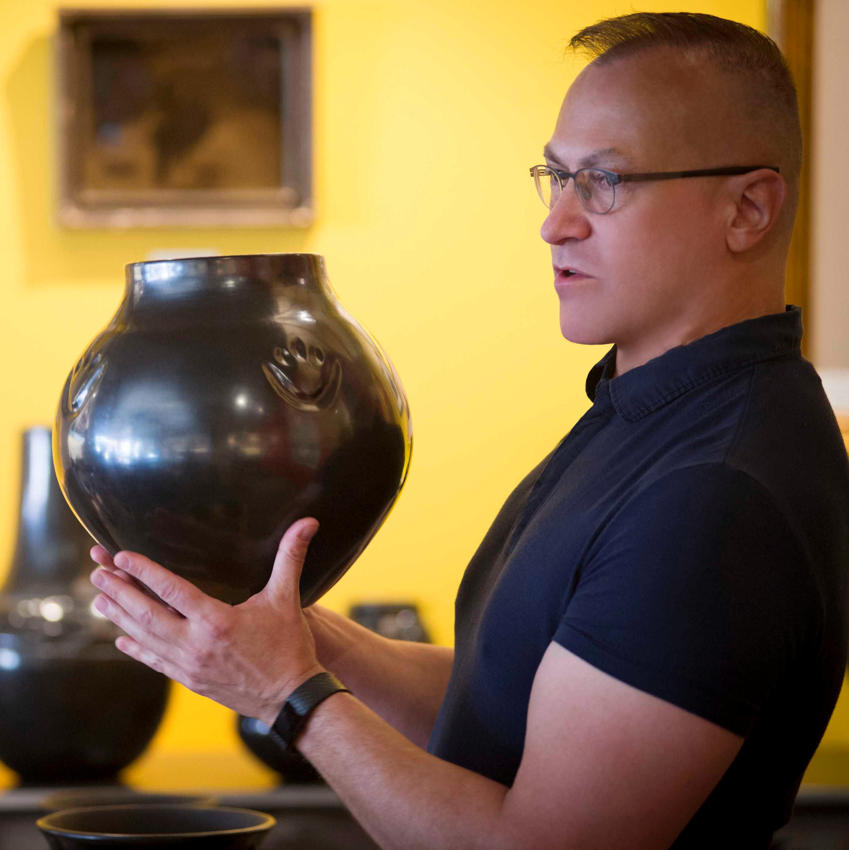 Charles S. King in King Galleries | Scottsdale & Santa Fe, 2018. King Galleries of Scottsdale is pleased to represent the Pueblo pottery of many of today’s leading potters. Over the years we have taken the time to get to know each of our gallery artists. As each new piece comes into the gallery, we talk with the artist, finding out about the time and thought that goes into their work. It is important with contemporary pottery to understand the designs and motivation of the artist and their work. Over time, we feel as if we not only have a business relationship with most of the potters, but also a friendship. Charles grew up in Estes Park, Colorado and while in High School worked at his parent’s gallery, Serendipity Trading. He received his BA from the University of Colorado and his MBA from the Thunderbird School of Global Management. He worked overseas and then in 1996 opened King Galleries. The goal has been to create a gallery which represents work by potters and artists who create the highest quality and inspire the greatest innovation in their art. Charles King has been a judge in various years since 1996 for pottery at the most prestigious Indian art events, such as Santa Fe Indian Market, the Heard Museum Indian Market, and Gallup Ceremonials. He has also given numerous talks on Pueblo pottery at the Heard Museum, Museum of Indian Art and Culture (MIAC), the Carnegie Museum, the Ceramics Research Center- ASU, the Pueblo Grande Museum, Rockwell Museum of Western Art, The Philbrook Museum and The Denver Art Museum. He has also worked closely with various museums for pottery exhibitions over the years. He advises various auctions houses and museums to assist in the authentication of work by historic pueblo artists, which are then either sold or donated. Charles served on the Board of Directors of the Indian Arts and Crafts Association (IACA), which has the mission of encouraging and preserving authentic Indian art. He was elected in 2008 to the Board of Directors for SWAIA (Southwest Association for Indian Arts), which is the group which puts on Santa Fe Indian Market. He first wrote about Pueblo pottery in the book “Collecting Authentic Indian Art,” and this was followed by the article, “Pueblo Pottery: Folk Art to Fine Art” for the thirtieth anniversary of American Indian Art Magazine. His first book, Born of Fire: The Life and Pottery of Margaret Tafoya, was published in 2008. This book was published in conjunction with the Carnegie Museum in Pittsburgh, PA and the exhibit has since traveled to numerous other ventures. His articles, “Santa Clara and San Ildefonso Pottery: Black is Beautiful“-2009, and “Four Emerging Potters: Gen Next“-2010 were published in Native Peoples Magazine. His second book, “The Art and Life of Tony Da” was published in 2011 and written with Richard Spivey. Most recently he has written, “Virgil Ortiz: Revolt 1680/2180” in conjunction with the exhibition at the Denver Art Museum. In 2015-16 he took time away from the gallery to work with the Smithsonian Museums and Smithsonian Enterprises at their museum stores in Washington, DC. on several projects. His fourth book project, “Spoken Through Clay,“ was published in 2017! He spends his time between the galleries in Scottsdale and Santa Fe. SOME HIGHLIGHTS OVER THE YEARS…. May 2018 Phoenix Home & Garden Magazine March 14, 2018 In this program gallerist, researcher, and author Charles King discusses the artistry, history, and position of Pueblo pottery in the world of ceramics. Included in the presentation is an overview of his most recently completed book, “Spoken Through Clay,” which contains portraits and interviews of more than 40 Native American artists sharing their unique personal perspectives on their culture, traditions, and the locally sourced clay that is transformed into an art form through their hands. King will also provide insights into the aesthetics, dynamics, and artistry of Native pottery. Charles King has been a gallerist for over twenty years and an author of four books on Native American pottery: “Born of Fire: The Life and Pottery of Margaret Tafoya”, “The Art and Life of Tony Da”, “Virgil Ortiz: Revolt 1680/2180” and his most recent book, “Spoken Through Clay.” In addition to King Galleries, he has been a consultant at the Smithsonian National Museum of the American Indian and spoken at the Heard Museum, Museum of Indian Art and Culture (MIAC), the Carnegie Museum, the Ceramics Research Center- ASU, the Rockwell Museum of Western Art, The Philbrook Museum and The Denver Art Museum on various topics dealing with Native pottery. He has been a judge at Santa Fe Indian Market, the Heard Museum Indian Market, and other art events.